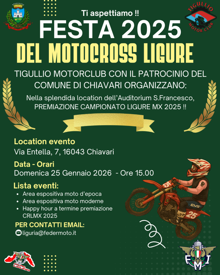 Domenica 25 gennaio 2026, a partire dalle ore 15:00, presso l’Auditorium San Francesco di Chiavari (Via Entella, 7) ospiterà la cerimonia di premiazione ufficiale del Campionato Regionale Ligure MX 2025. Un momento di grande festa e riconoscimento per tutti i protagonisti che hanno reso indimenticabile la stagione motociclistica ligure.